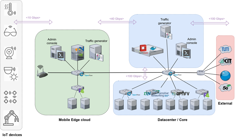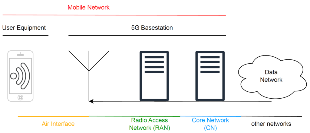 A 5G Non-Public-Network (5G NPN) consists of different components which are all available in the testbed. The first component is the user equipment (UE), this is most easily described as a smartphone with a SIM-Card. The SIM-Card is the identifier and cryptographic device, required to access the network. Via cellular technology the user equipment connects to the 5G base station, where one or multiple cells can be deployed. The 5G base station consists of two primary components: the Radio Access Network (RAN) and the Core Network (CN). The RAN can utilize either commercially available hardware (COTS) or application-specific integrated circuits (ASICs). In contrast, the CN exclusively employs COTS hardware across all testbeds. The CN encompasses various network functions, including authentication and mobility management, session management, user data management, policy control, and the gateway to other data networks.