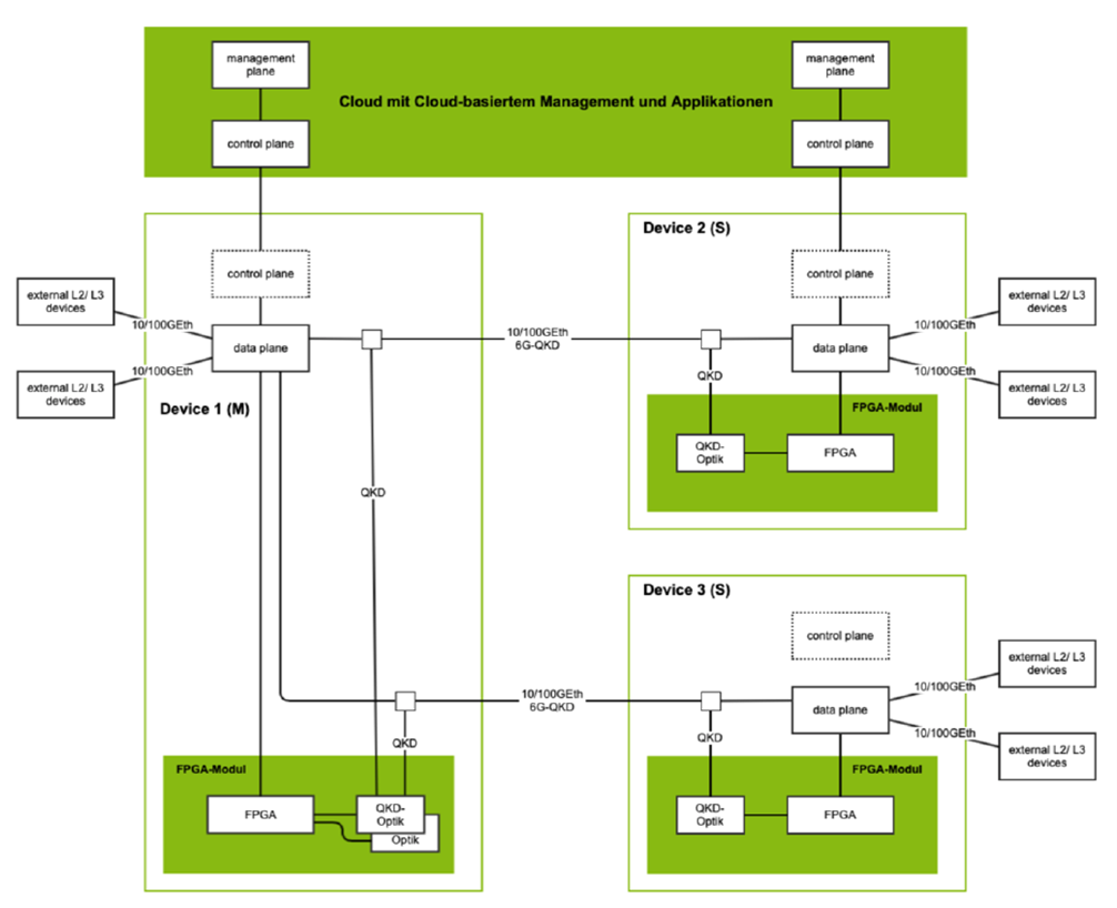 The demonstrator consists of a three-nodes 6G network with Radio Access Network (RAN) and Mobile Edge Cloud (MEC), which are secured via Continuous Variables (CV) Quantum Key Distribution (QKD). The quantum physical layer is integrated into the link and network layer operations in order to enable the key generation and distribution through the network according to applications‘ requirements. In addition, it ensures communication is not compromised and provides feedback to the management system in case of an attack.