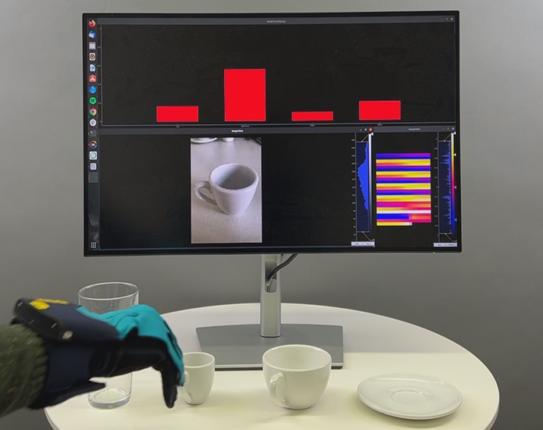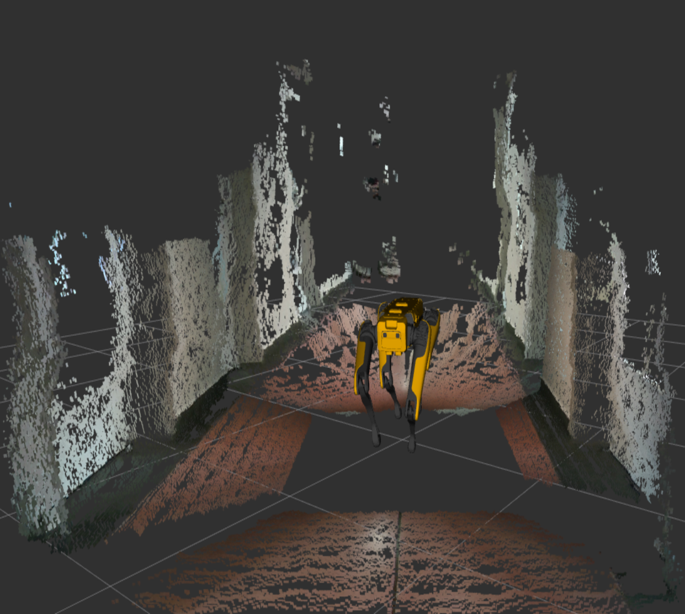 The Human Machine Interface should fulfil two tasks. It should provide the operator with a real-time representation of Spot’s environment. The visualization of the camera data does not provide a sufficient Quality of Experience (QoE) because a sense of depth and the already visited environment are lost to the operator. Therefore, an accurate and real-time 3D map, generated by Visual or LiDAR Simultaneous Localization and Mapping (SLAM) systems, should be displayed. In addition, the control by gesture recognition shall lead to an increased QoE.