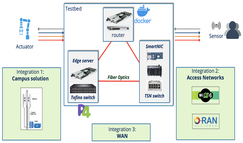 For integration testing, All-In-One Small Cells are available. These compact and easy-to-operate gNBs can be quickly deployed due to their simplified operation compared to legacy systems or disaggregated O-RAN. Vendors within the testbed include: AirSpan Airvelocity n78 (2T2R), T&W/Node-H small Cell n78 (2T2R), LiteOn FlexFI n78 (4T4R), and NI USRP N310.