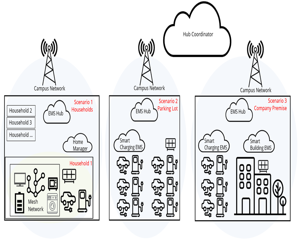 The first physical location is a test site situated inside Barkhausenbau TU Dresden, featuring a bi-directional charging point, a battery electric vehicle (BEV), and photovoltaic panels. The second physical location is a parking lot in Dresden Südhöhe, equipped with multiple charging points. Both the downscaled test site and the virtual simulated test sites introduce diversity by offering a variety of scenarios with different configurations. This allows researchers to explore the complexities of renewable energy management under various conditions and settings, fostering a deeper understanding of the challenges and opportunities in this field. By interconnecting these diverse “Areas Behind the Meter,” the testbed presents a unique opportunity to study low-latency energy grid optimization using advanced technologies such as 5G and artificial intelligence. This comprehensive platform enables researchers to develop intelligent energy management systems that can enhance the efficiency, resilience, and interconnectedness of the energy landscape.