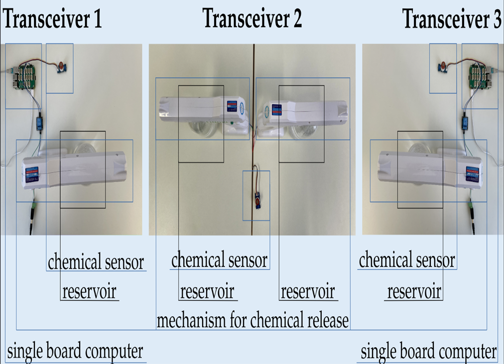 The MC testbed is a macroscale system comprising three nodes that enables both unidirectional and bidirectional transmissions. The system can be restructured to support both SISO and MIMO transmissions. The transmitter node releases ethanol molecules, which diffuse through the free space channel to the sensor of the receiving node to facilitate communication. The nodes are equipped with at least one actuator and one sensor; the middle node owns two actuators, for bidirectional release of the molecules. The hardware of the nodes includes a chemical sensor designed for molecule detection, an actuator for releasing the molecules, and a single board computer (Raspberry Pi). The actuator comprises a molecule reservoir and a mechanism for the chemical release of the molecules.